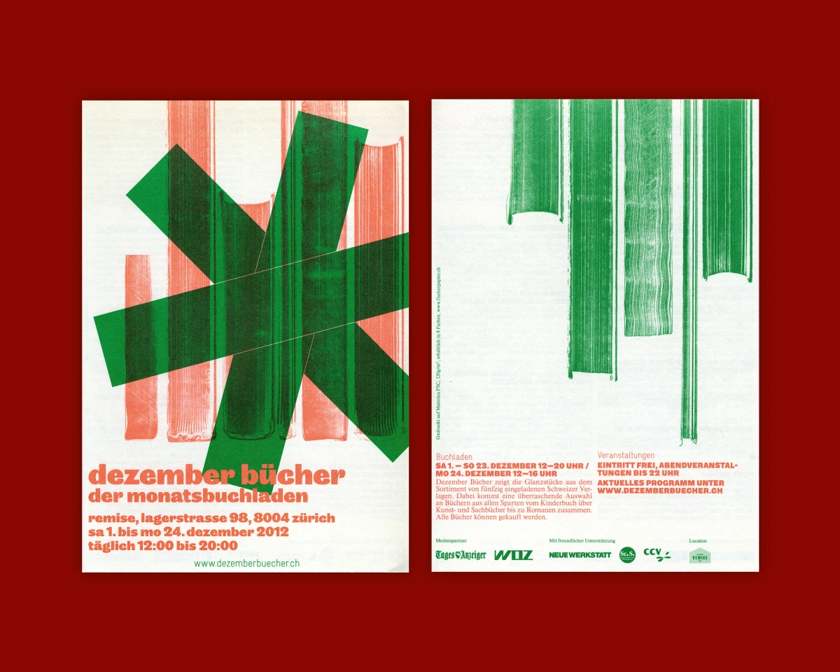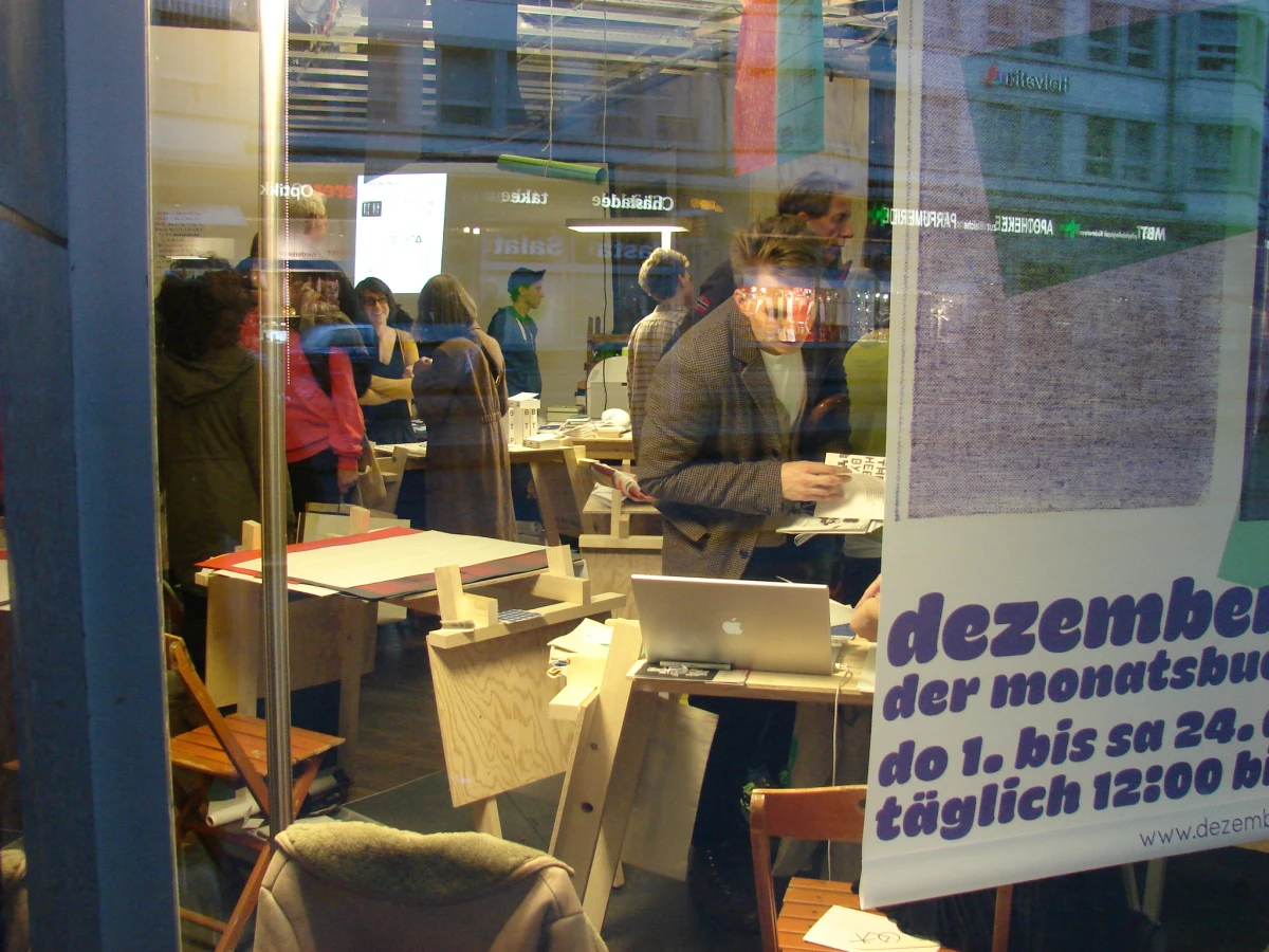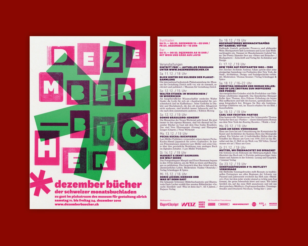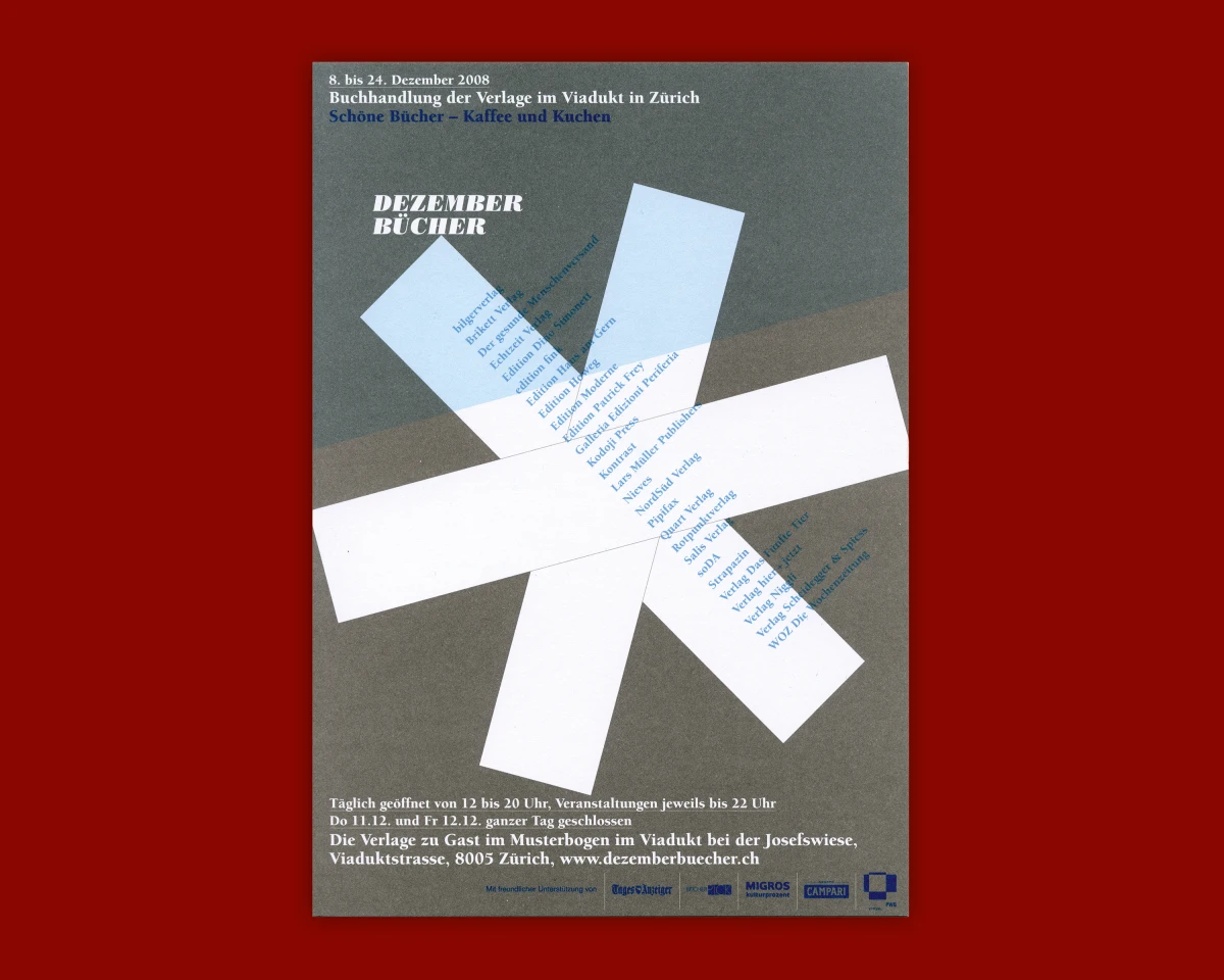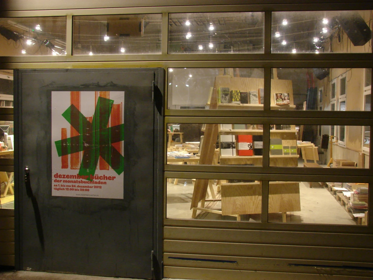 «Dezember Bücher». Dieses Projekt entstand auf Initiative des Brikett Verlages. Unsere Idee war, vor Weihnachten einen temporären Buchladen für Verlage zu organisieren. Dazu suchten wir einen Raum zur Zwischennutzung und luden Verlage ein, je ein Dutzend Bücher für die Pop-up-Buchhandlung beizusteuern. Jeder teilnehmende Verlag organisierte auch Veranstaltungen, zu denen er sein Publikum einlud. Am Projekt, das von 2008 bis 2012 vier Mal durchgeführt werden konnte, haben Christine Moser, Michel Fries und Tobias Jordi mitgewirkt.