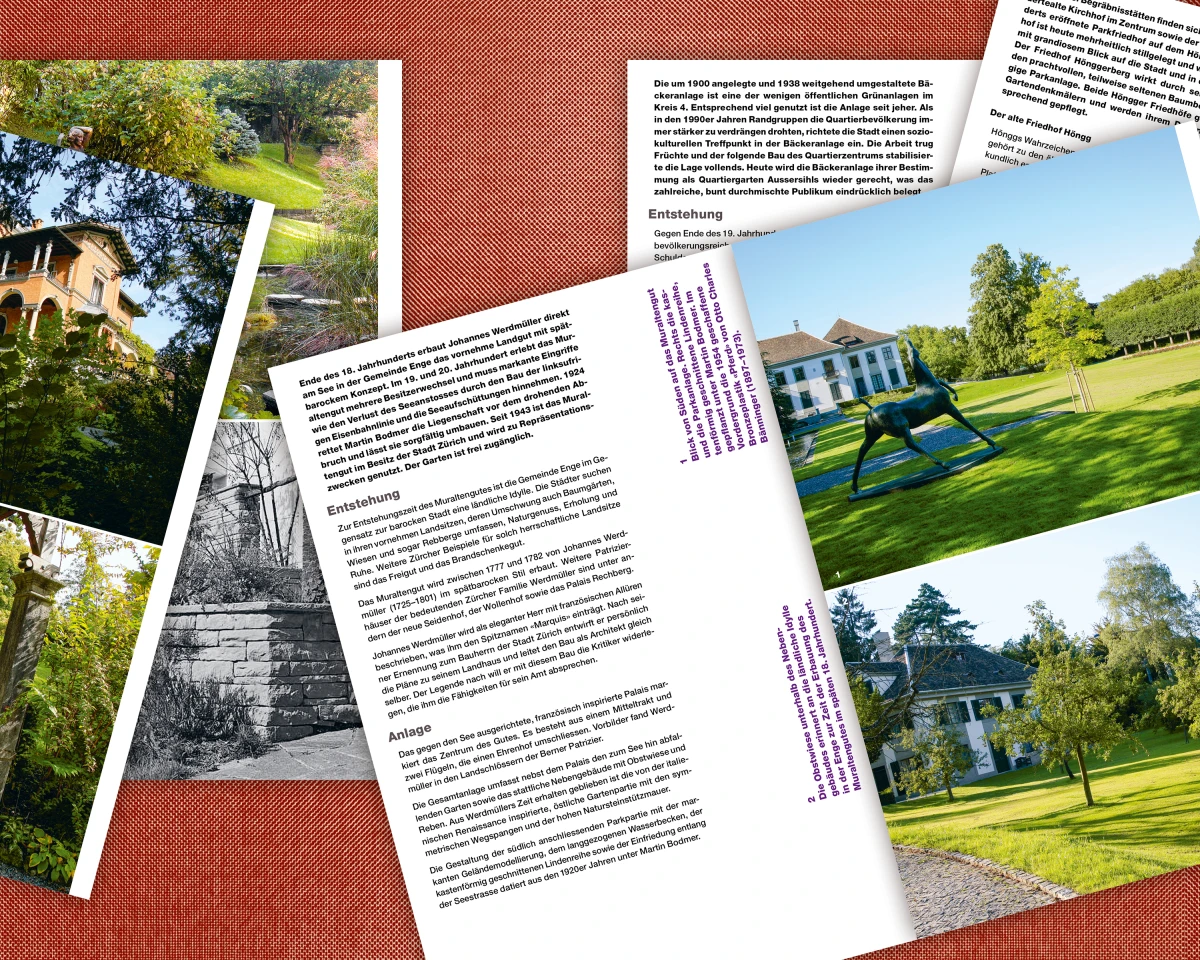 Faltblätter zu allen zwanzig Gartendenkmälern der Stadt Zürich. Zu jedem Gartendenkmal gibt ein Faltblatt ausführlich Auskunft über Entstehung und Entwicklung der Anlage. Die Faltblätter können bei der Gartendenkmalpflege der Stadt Zürich kostenlos bestellt werden. Sende dafür eine E-Mail an Judith Rohrer – sie freut sich! 160 x 240 mm, dreiteiliges Faltblatt.