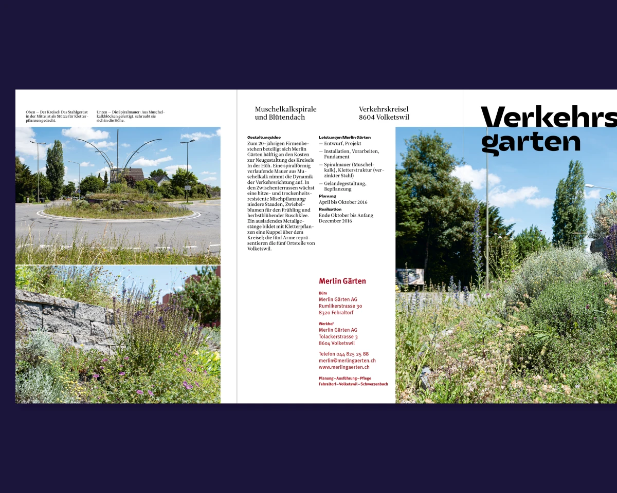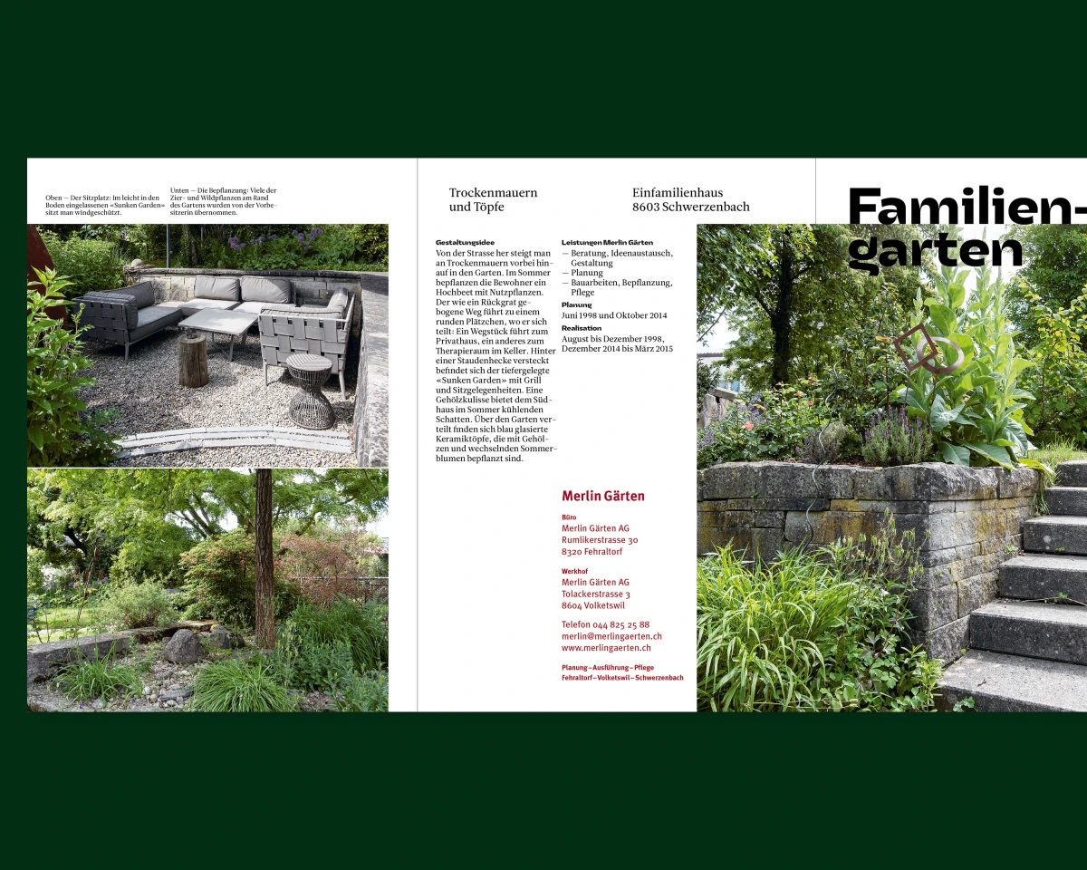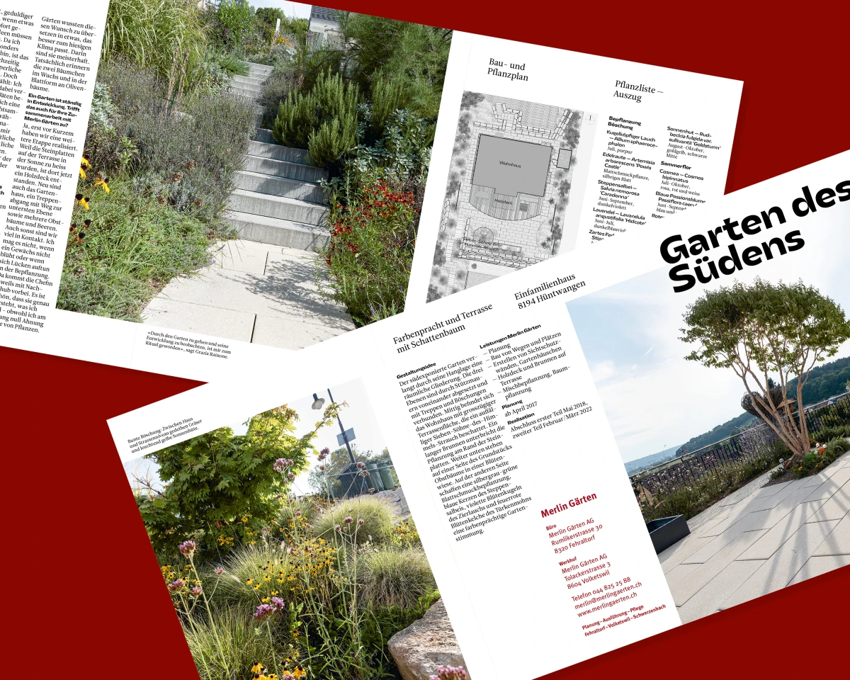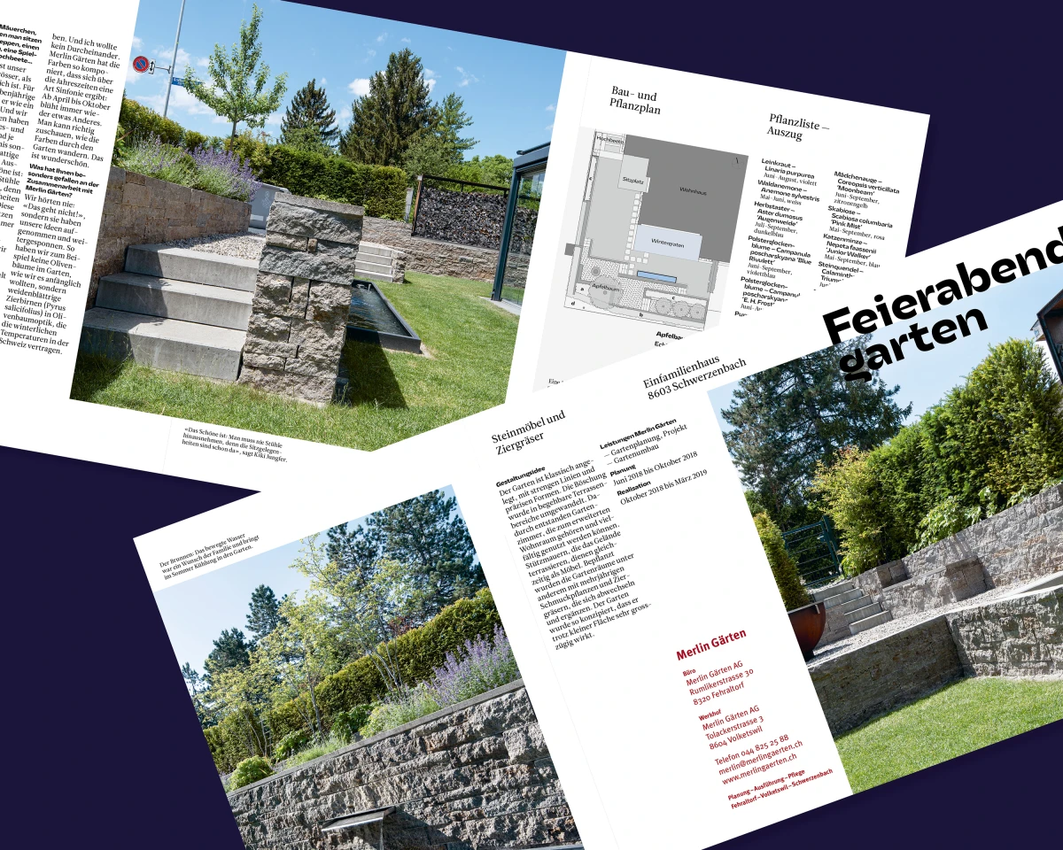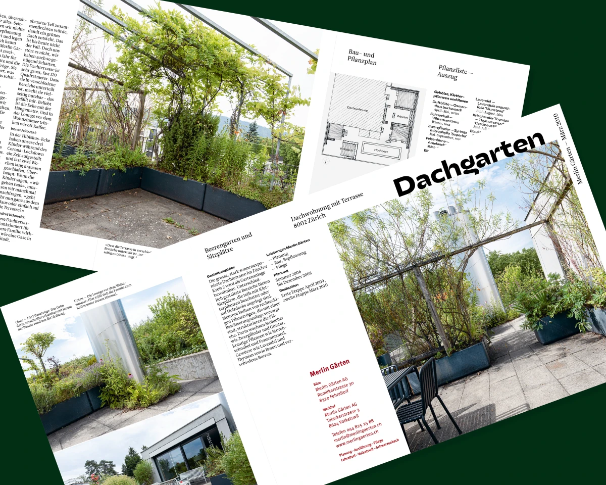 Merlin Gärten dokumentiert in loser Folge seine fertiggestellten Gärten mit einem dreiteiligen Faltblatt. Grosszügige Bilder gewähren einen Einblick in die Gärten, es gibt immer ein Interview mit den Gartenbesitzerinnen und Gartenbesitzern, eine komplette Pflanzliste und einen Plan der Gartenanlage. Die Faltblätter dienen Merlin Gärten als Referenzen und als Diskussionsgrundlagen im Gespräch mit Neukundinnen und -kunden. Die einzelnen Projektdokumentationen sind in einer Mappe zusammengefasst. 148 x 210 mm, dreiteiliges Faltblatt.
