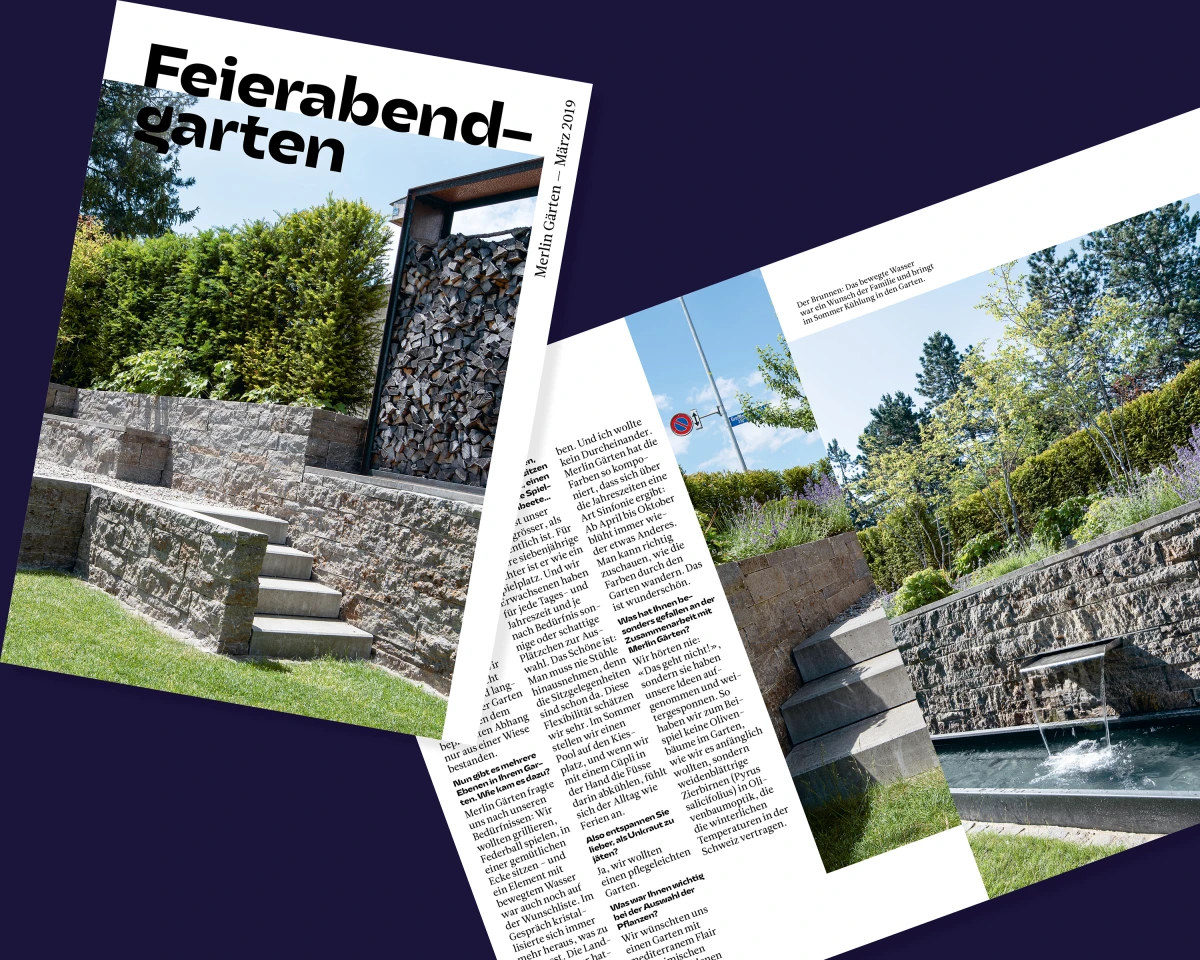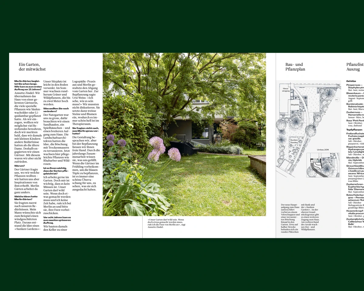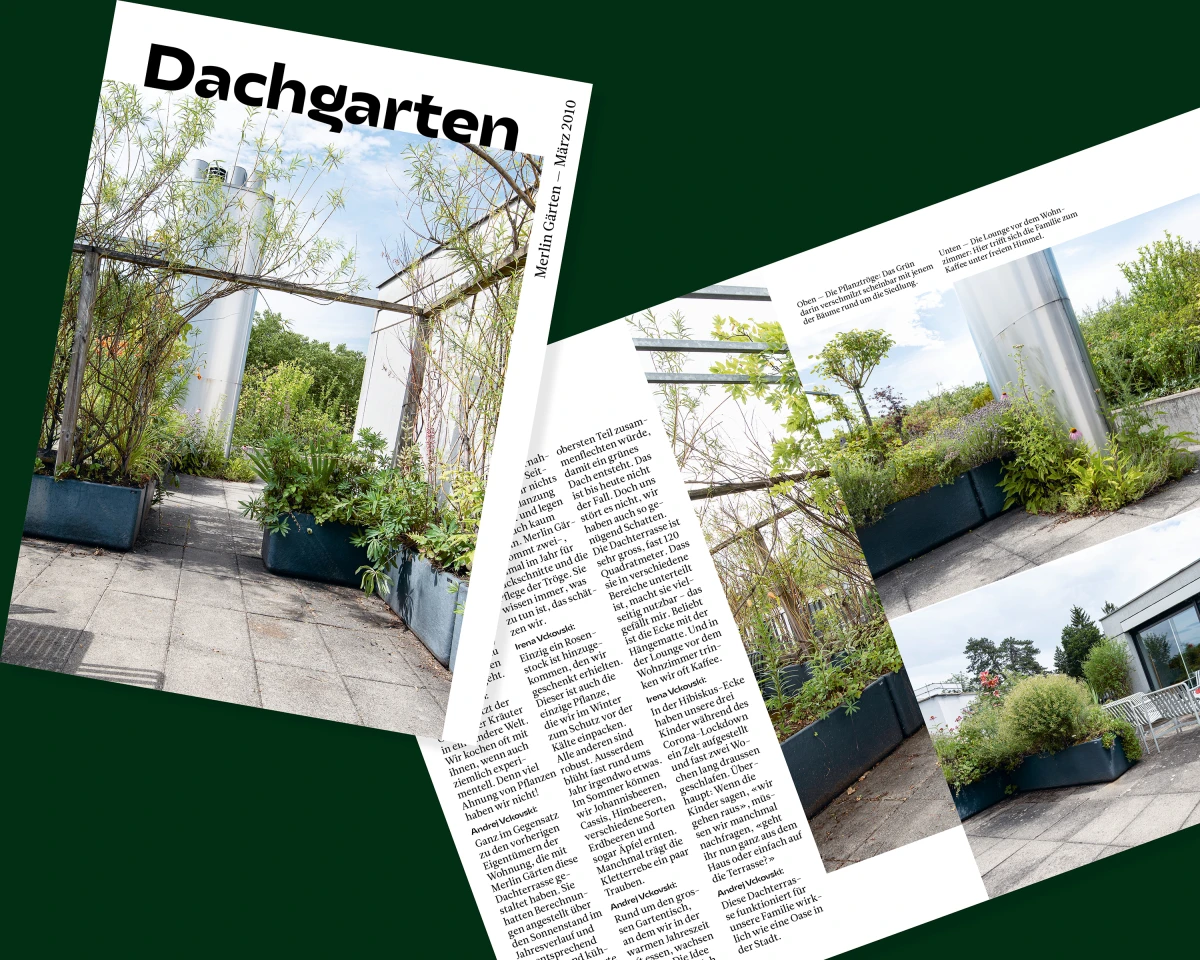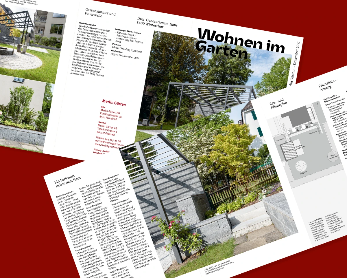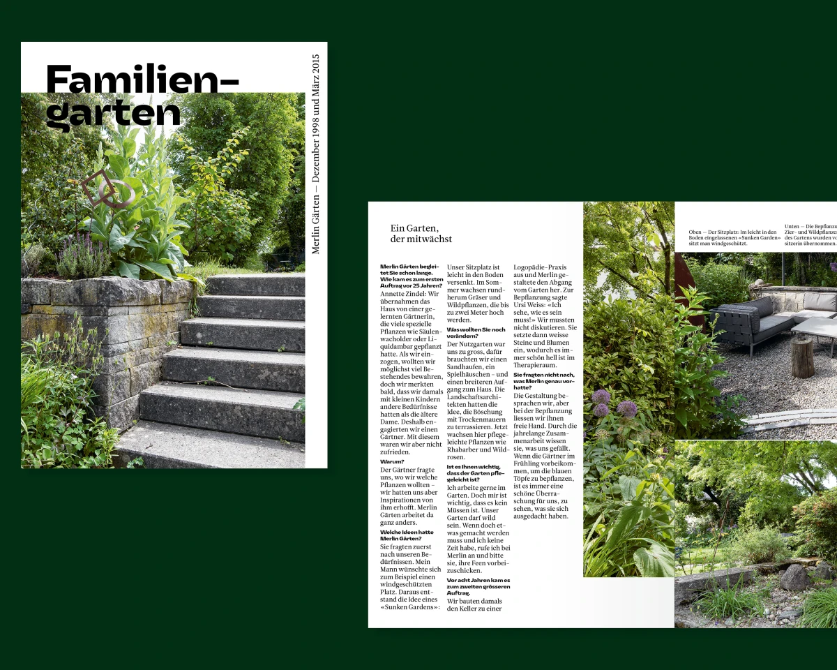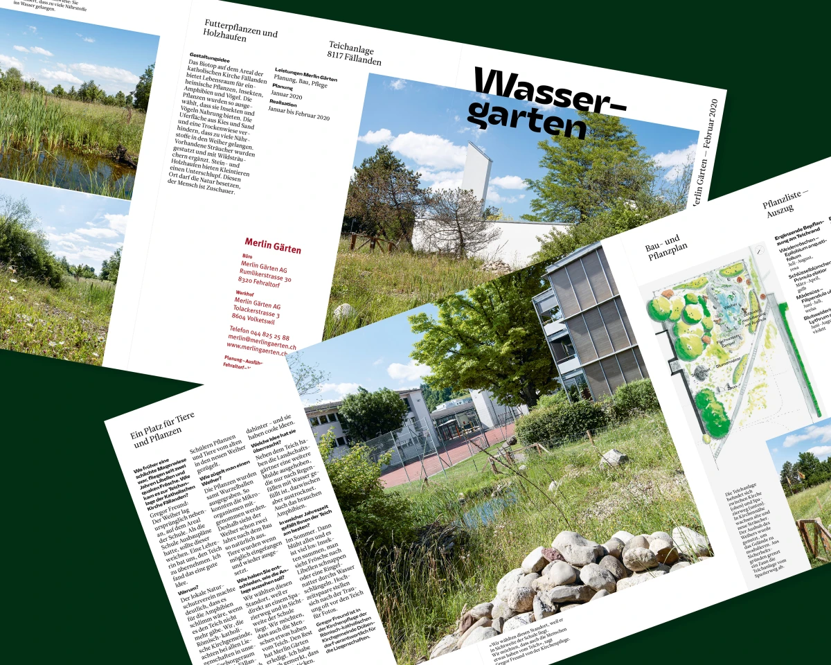Merlin Gärten dokumentiert in loser Folge seine fertiggestellten Gärten mit einem dreiteiligen Faltblatt. Grosszügige Bilder gewähren einen Einblick in die Gärten, es gibt immer ein Interview mit den Gartenbesitzerinnen und Gartenbesitzern, eine komplette Pflanzliste und einen Plan der Gartenanlage. Die Faltblätter dienen Merlin Gärten als Referenzen und als Diskussionsgrundlagen im Gespräch mit Neukundinnen und -kunden. Die einzelnen Projektdokumentationen sind in einer Mappe zusammengefasst. 148 x 210 mm, dreiteiliges Faltblatt.
