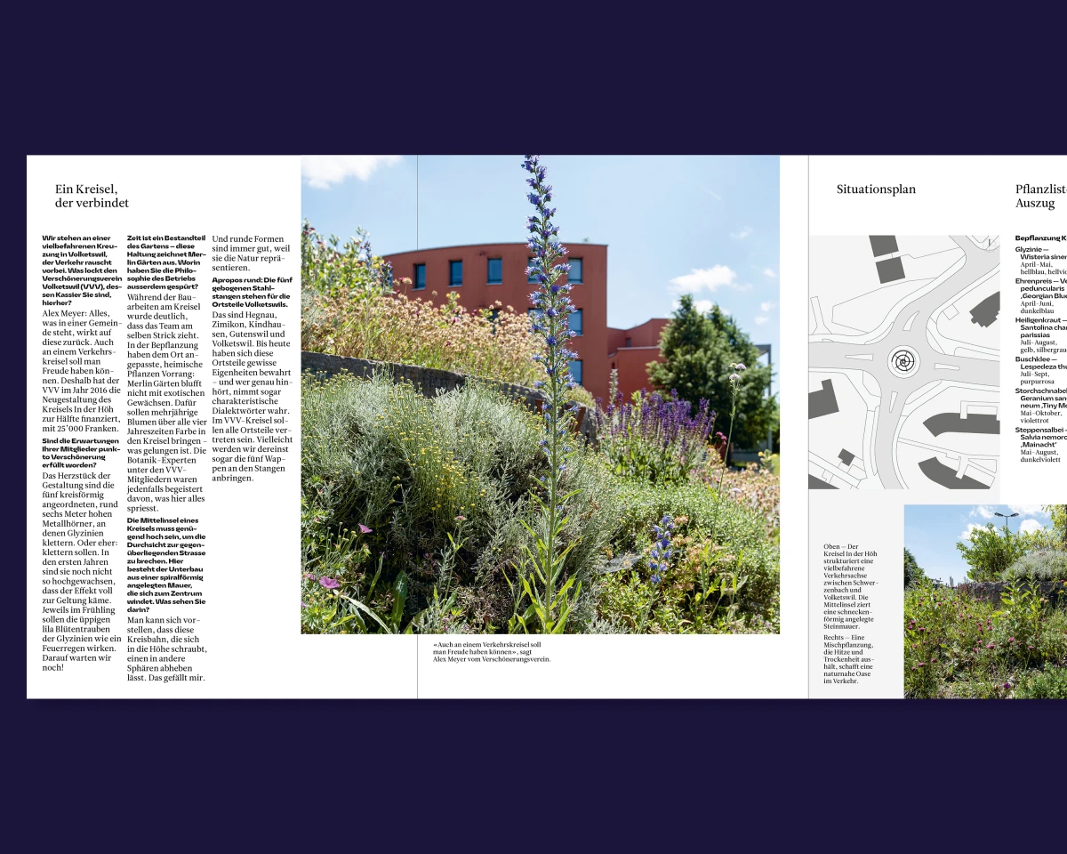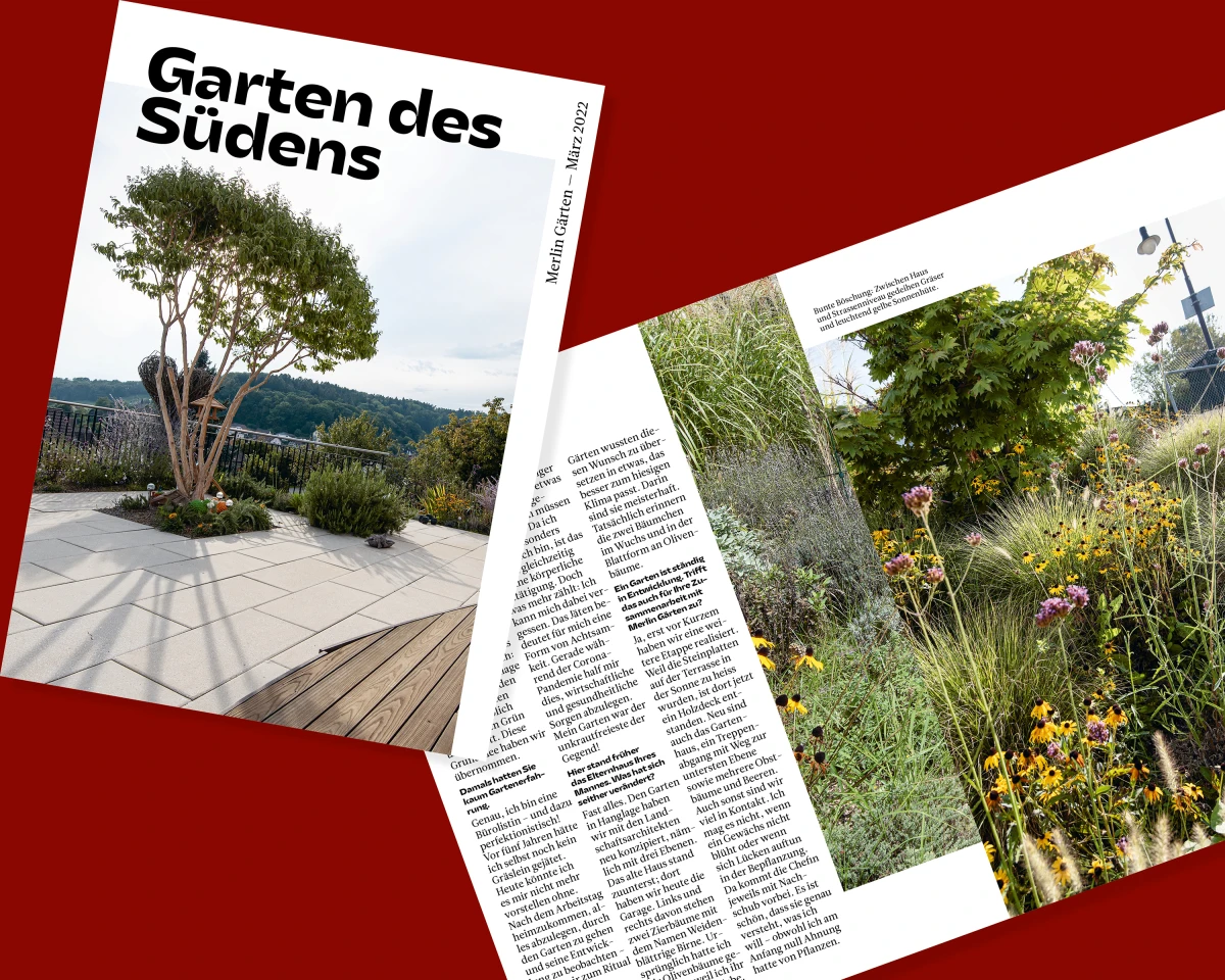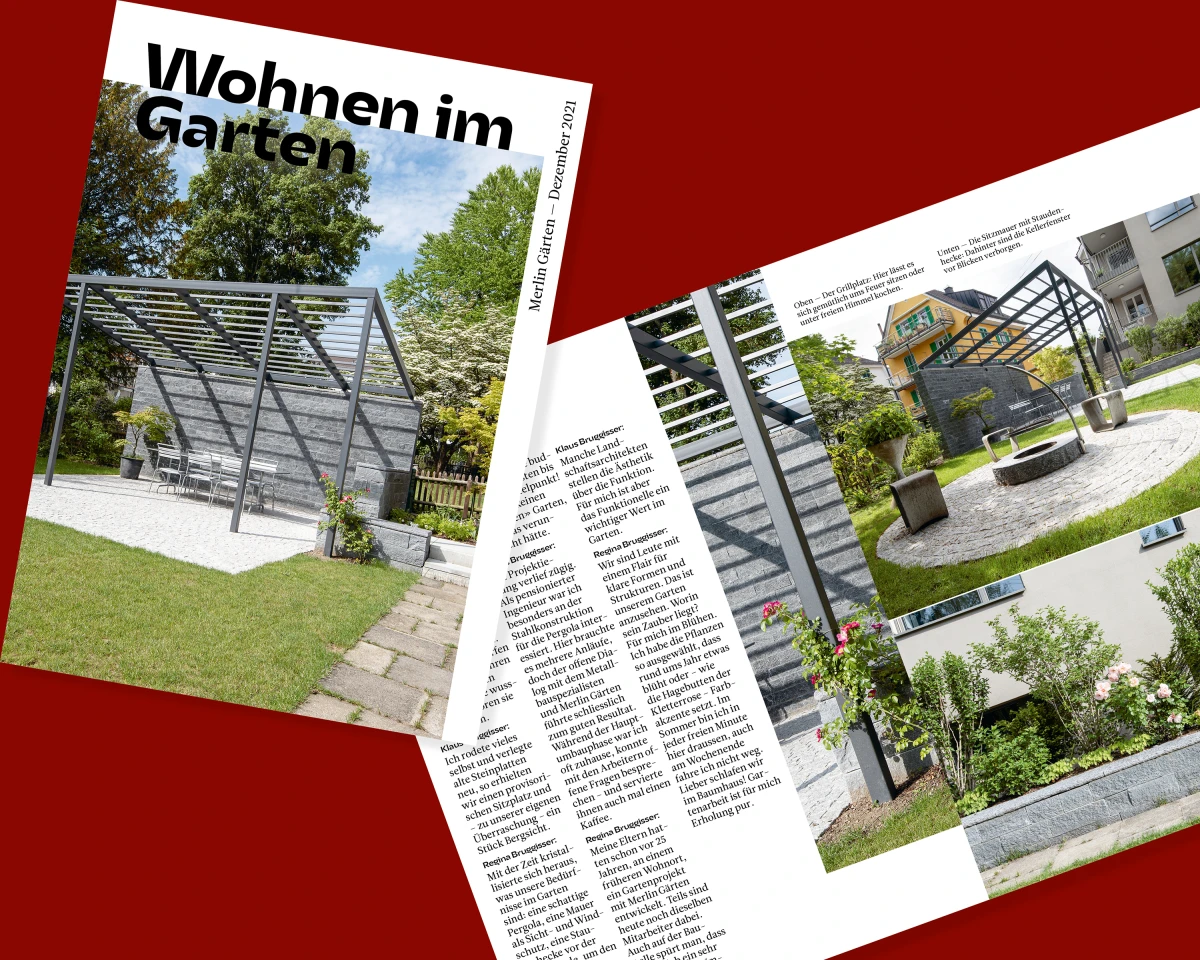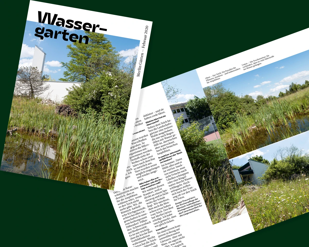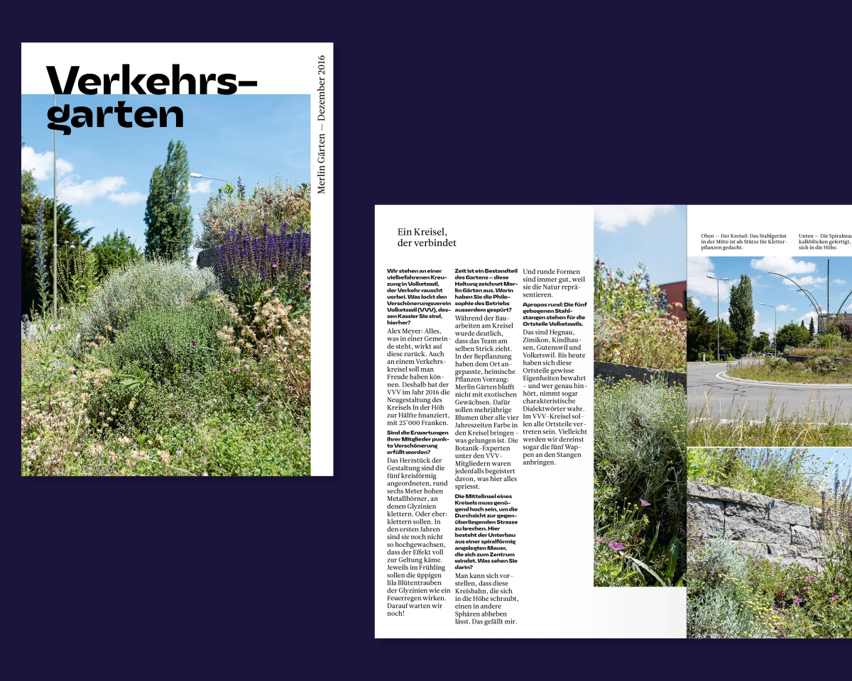 Merlin Gärten dokumentiert in loser Folge seine fertiggestellten Gärten mit einem dreiteiligen Faltblatt. Grosszügige Bilder gewähren einen Einblick in die Gärten, es gibt immer ein Interview mit den Gartenbesitzerinnen und Gartenbesitzern, eine komplette Pflanzliste und einen Plan der Gartenanlage. Die Faltblätter dienen Merlin Gärten als Referenzen und als Diskussionsgrundlagen im Gespräch mit Neukundinnen und -kunden. Die einzelnen Projektdokumentationen sind in einer Mappe zusammengefasst. 148 x 210 mm, dreiteiliges Faltblatt.