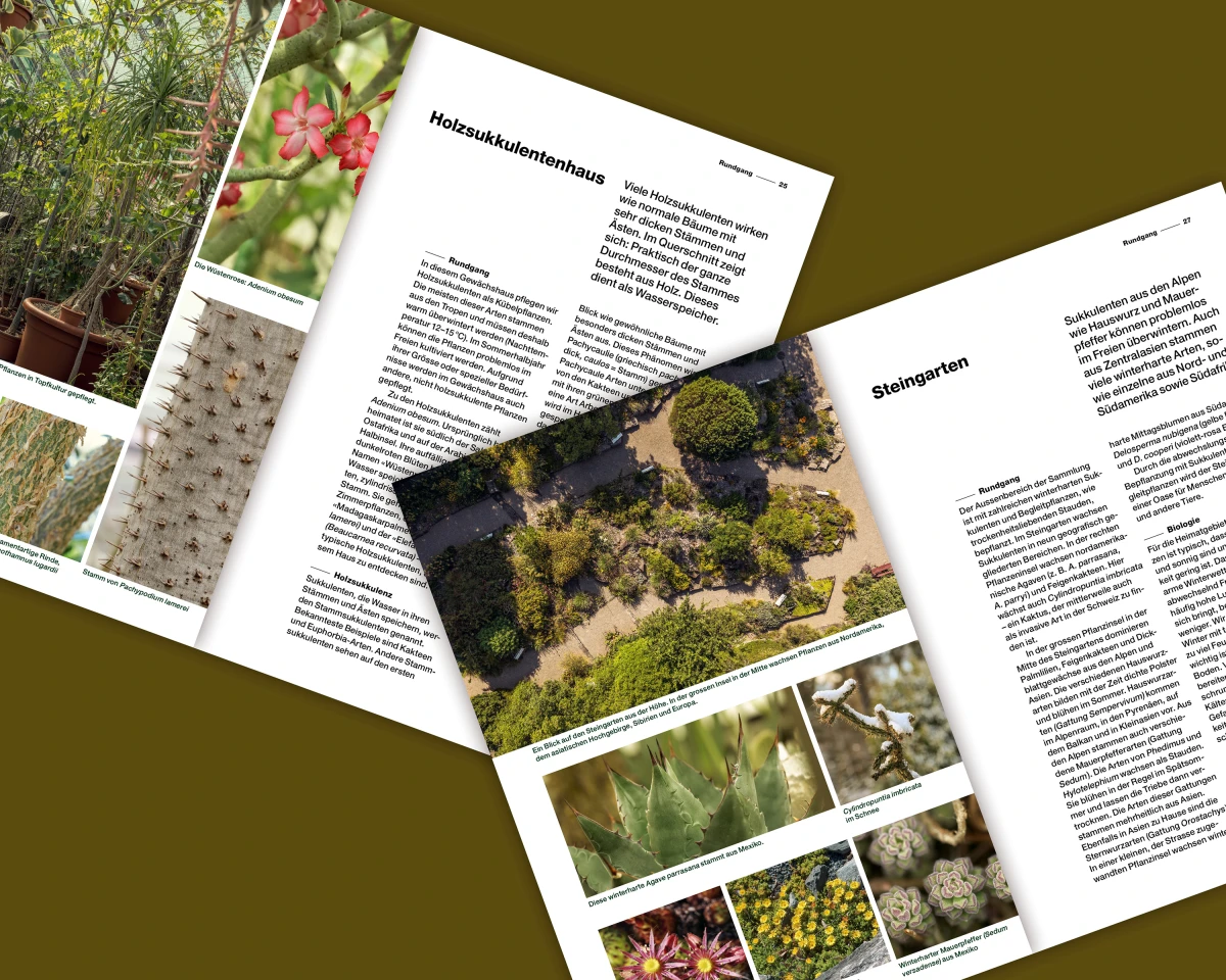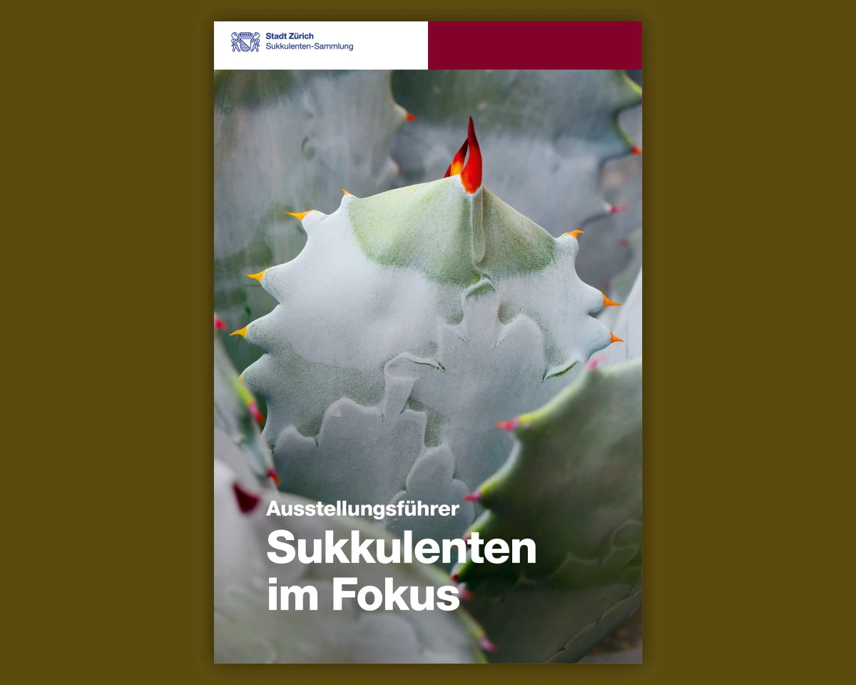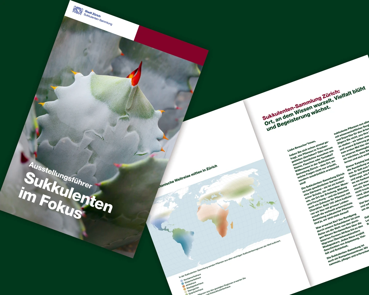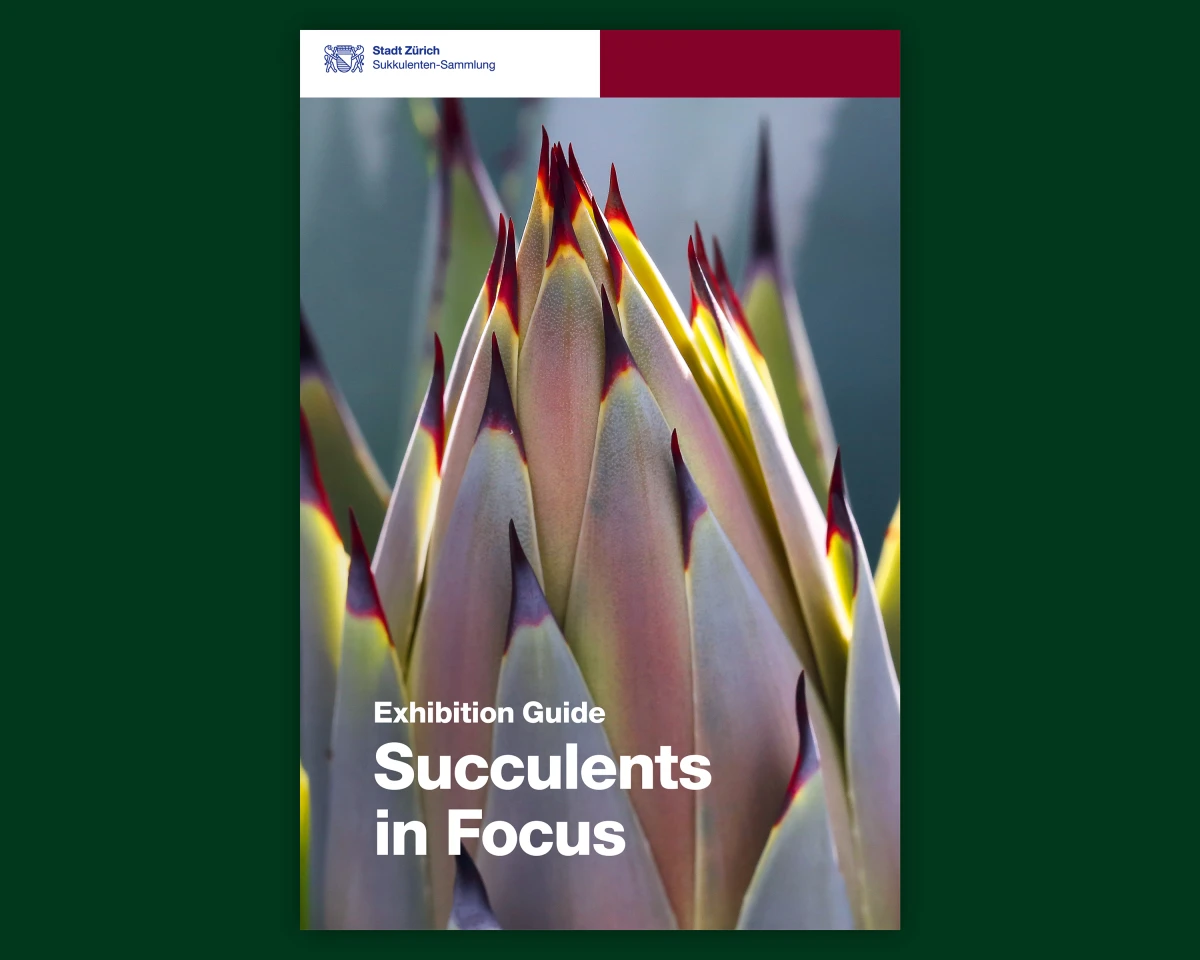 Der bestehende Ausstellugnsführer sollte dem aktuellen Erscheinungsbild der Stadt Zürich angepasst werden und dennoch die spezifischen Eigenheiten dieser einzigartigen Züricher Institution widerspiegeln. Durch die Trennung von Bildseiten und Textseiten wurde der Führer übersichtlich strukturiert. Sehr schön ist auch der neue Übersichtsplan geworden mit dem See als klare Orientierungshilfe im unteren Bildbereich. Den Aussstellungsführer gibt es in der Sukkulten-Sammlung auf deutsch und englisch zu kaufen.