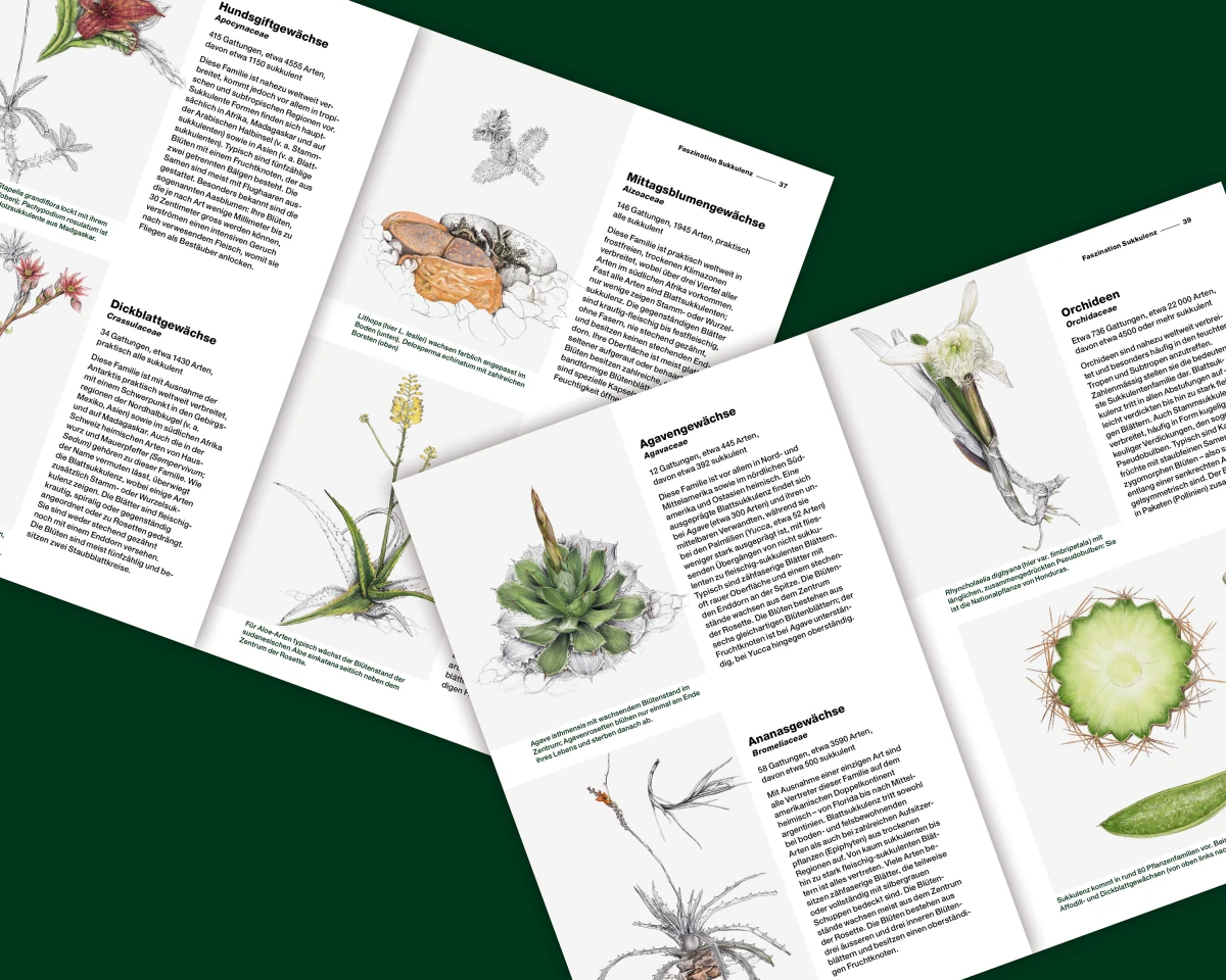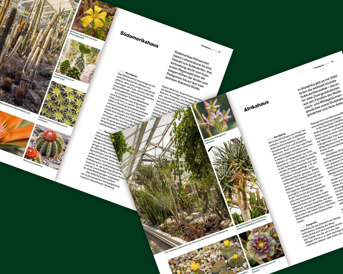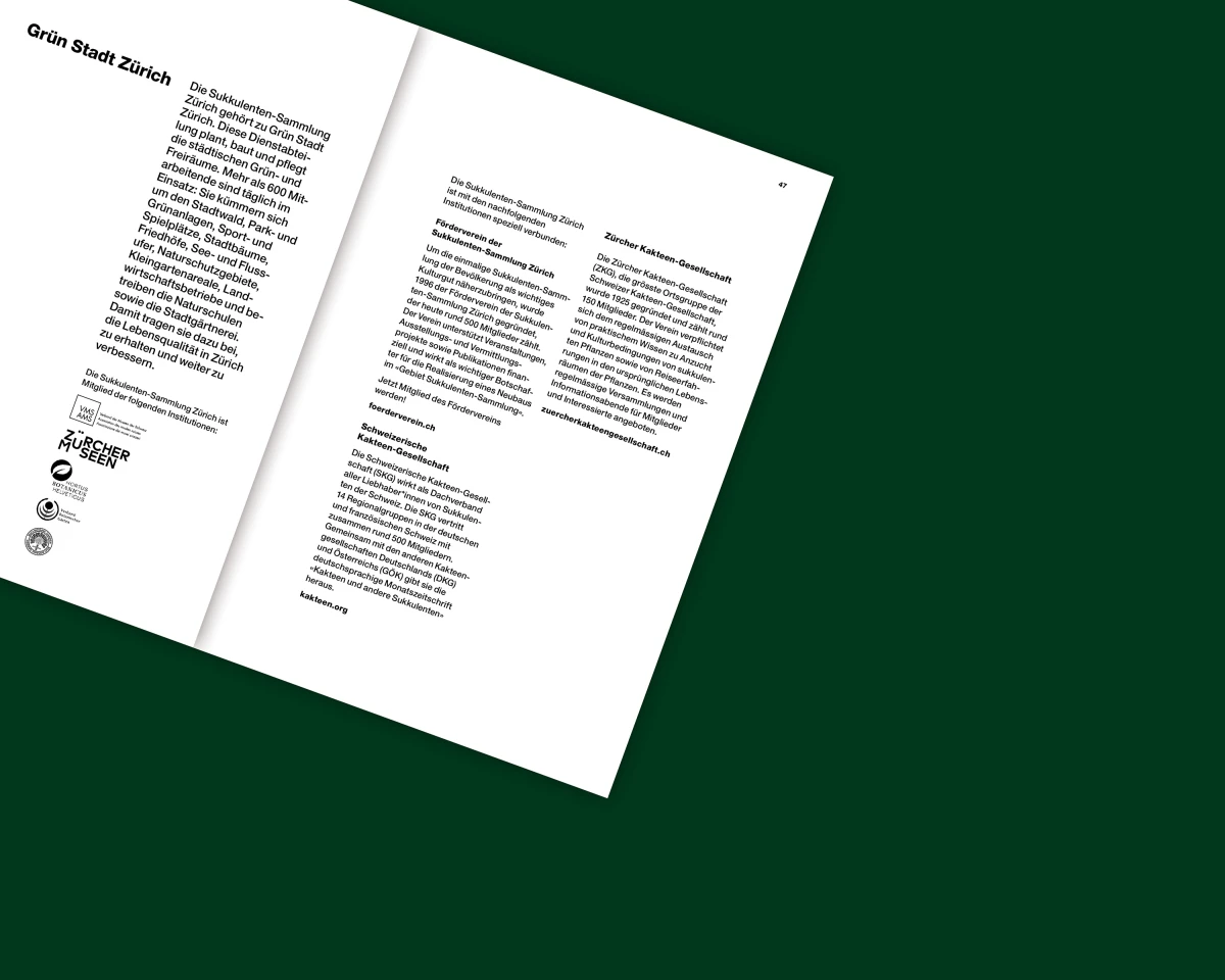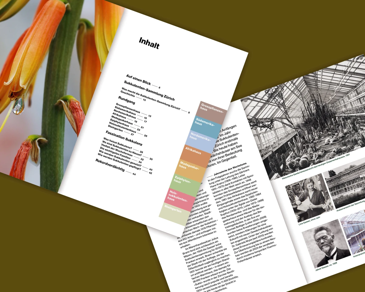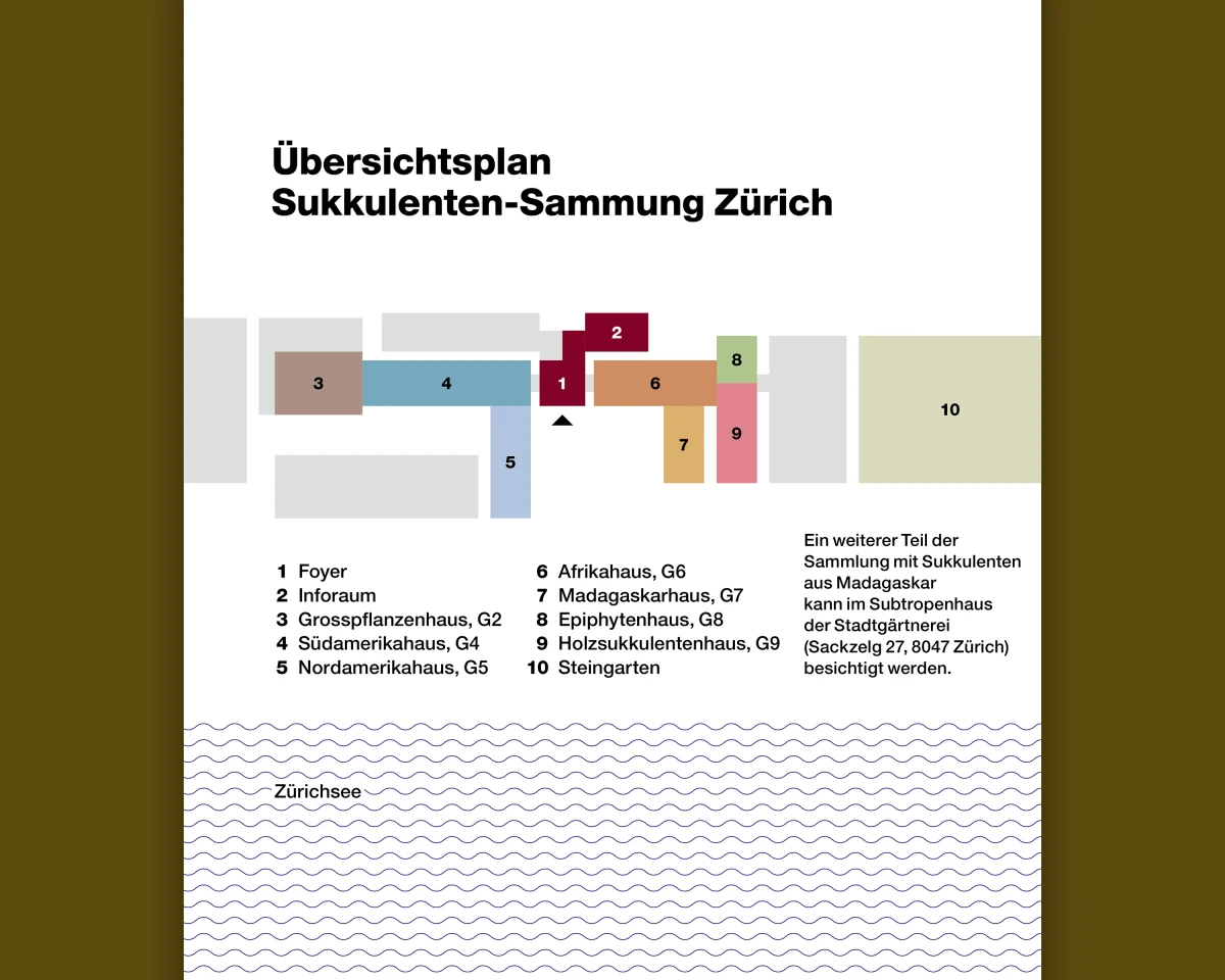 Der bestehende Ausstellugnsführer sollte dem aktuellen Erscheinungsbild der Stadt Zürich angepasst werden und dennoch die spezifischen Eigenheiten dieser einzigartigen Züricher Institution widerspiegeln. Durch die Trennung von Bildseiten und Textseiten wurde der Führer übersichtlich strukturiert. Sehr schön ist auch der neue Übersichtsplan geworden mit dem See als klare Orientierungshilfe im unteren Bildbereich. Den Aussstellungsführer gibt es in der Sukkulten-Sammlung auf deutsch und englisch zu kaufen.