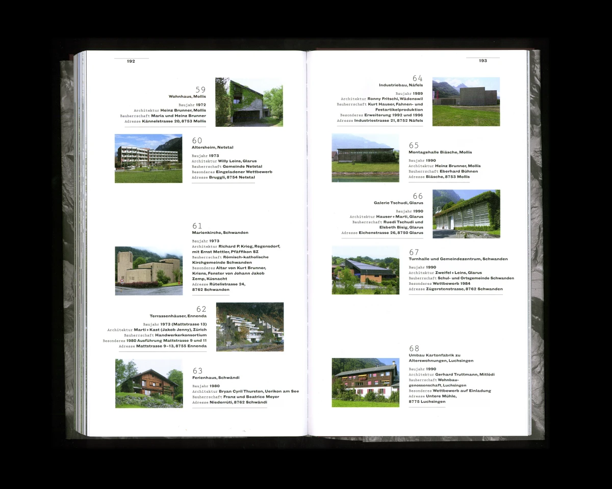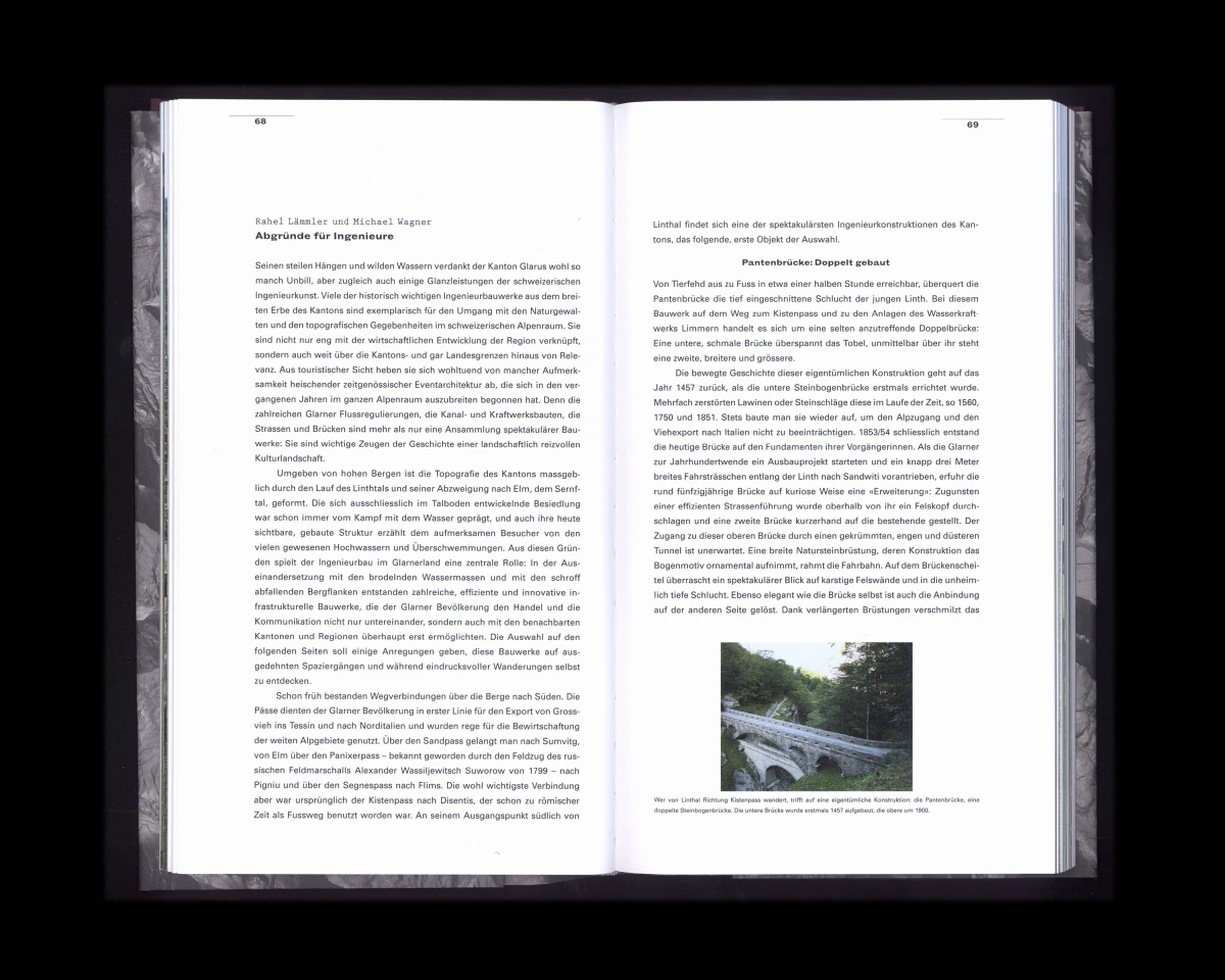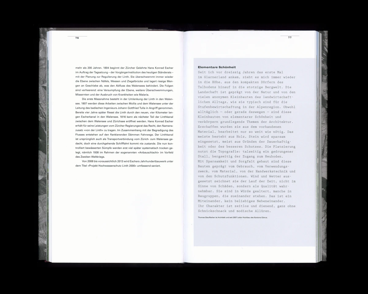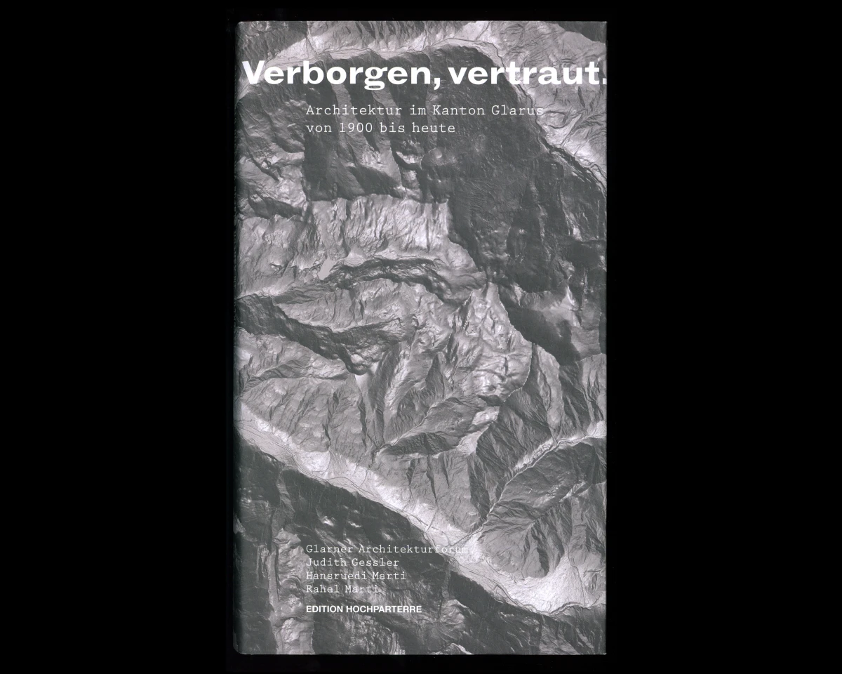 «Verborgen, vertraut. – Architektur im Kanton Glarus von 1900 bis heute». Dieses Buch konnte ich in enger Zusammenarbeit mit Judith Gessler, Hansruedi Marti und Rahel Marti entwickeln. Dem Buchkonzept liegt eine ausgeklügelte Systematik zugrunde. Wichtig waren mir die bearbeiteten Kartenausschnitte und ihre dem Buch entsprechende Darstellung, die Bezug nehmen auf das schroffe und felsige Glarnerland. 160 x 270 mm, 224 Seiten.